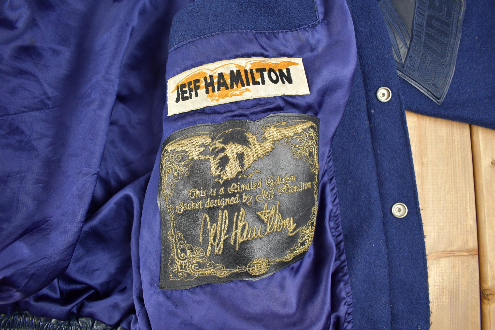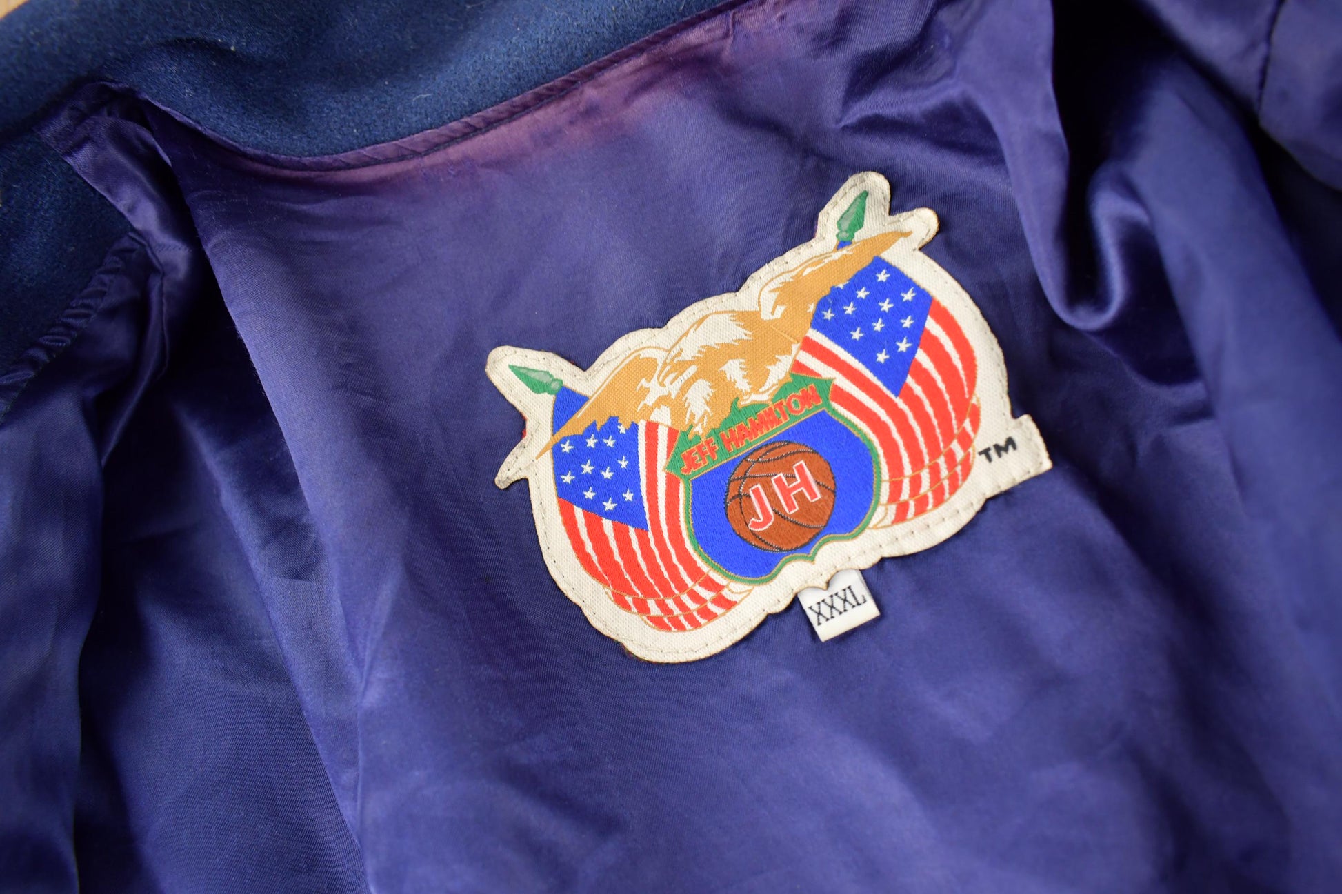 Vintage 1990s Jeff Hamilton NBA Basketball Team Logo Leather Patchwork Wool Jacket