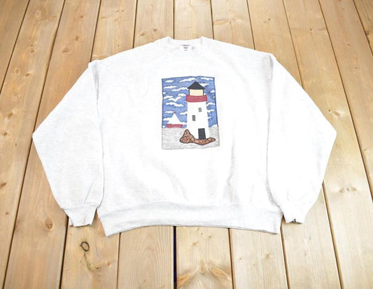 Vintage 1990s Lighthouse Embroidered Cute Crewneck Sweatshirt Made In USA -