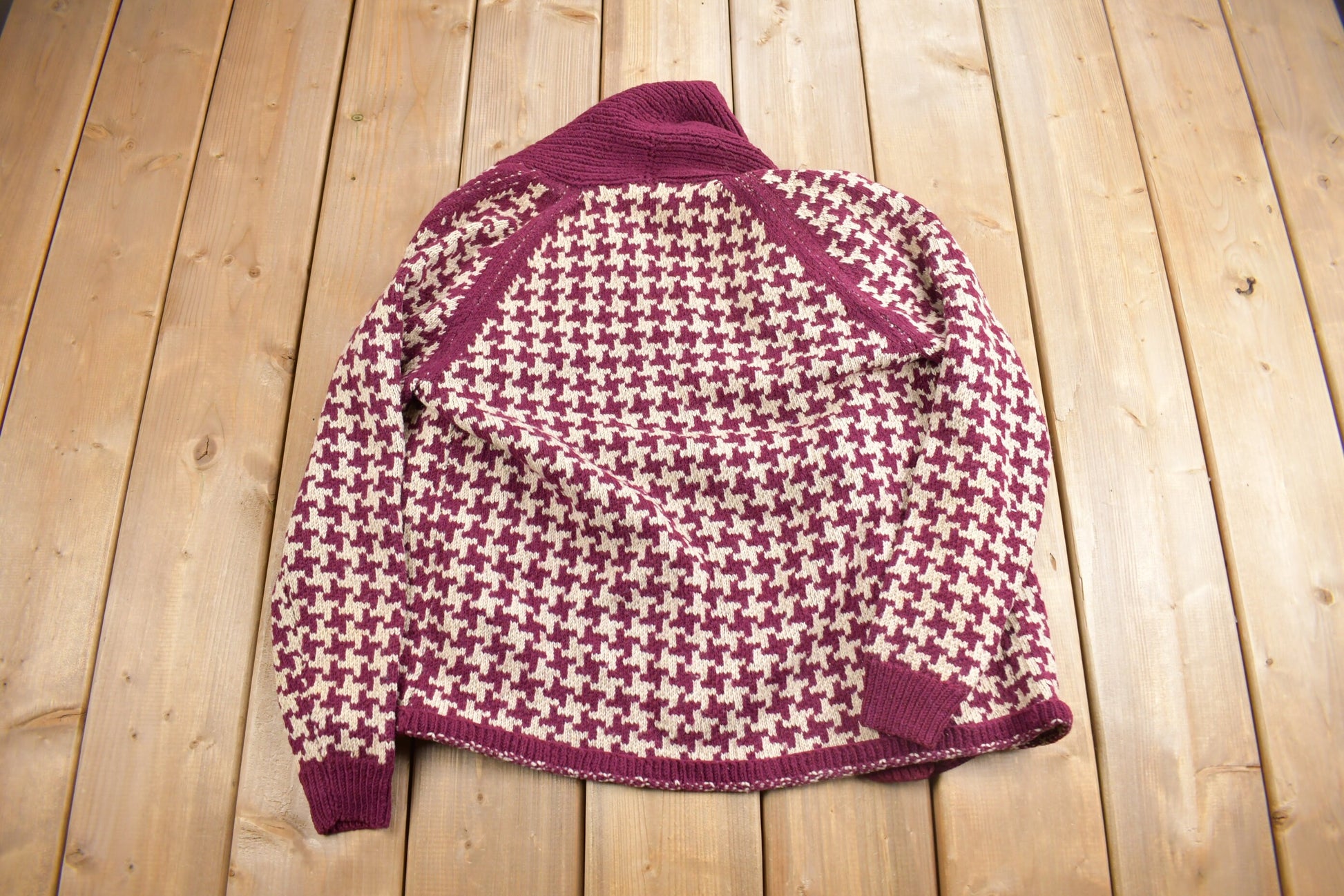 Vintage 1970s Houndstooth Shawl Collar Knit Cardigan Sweater -
