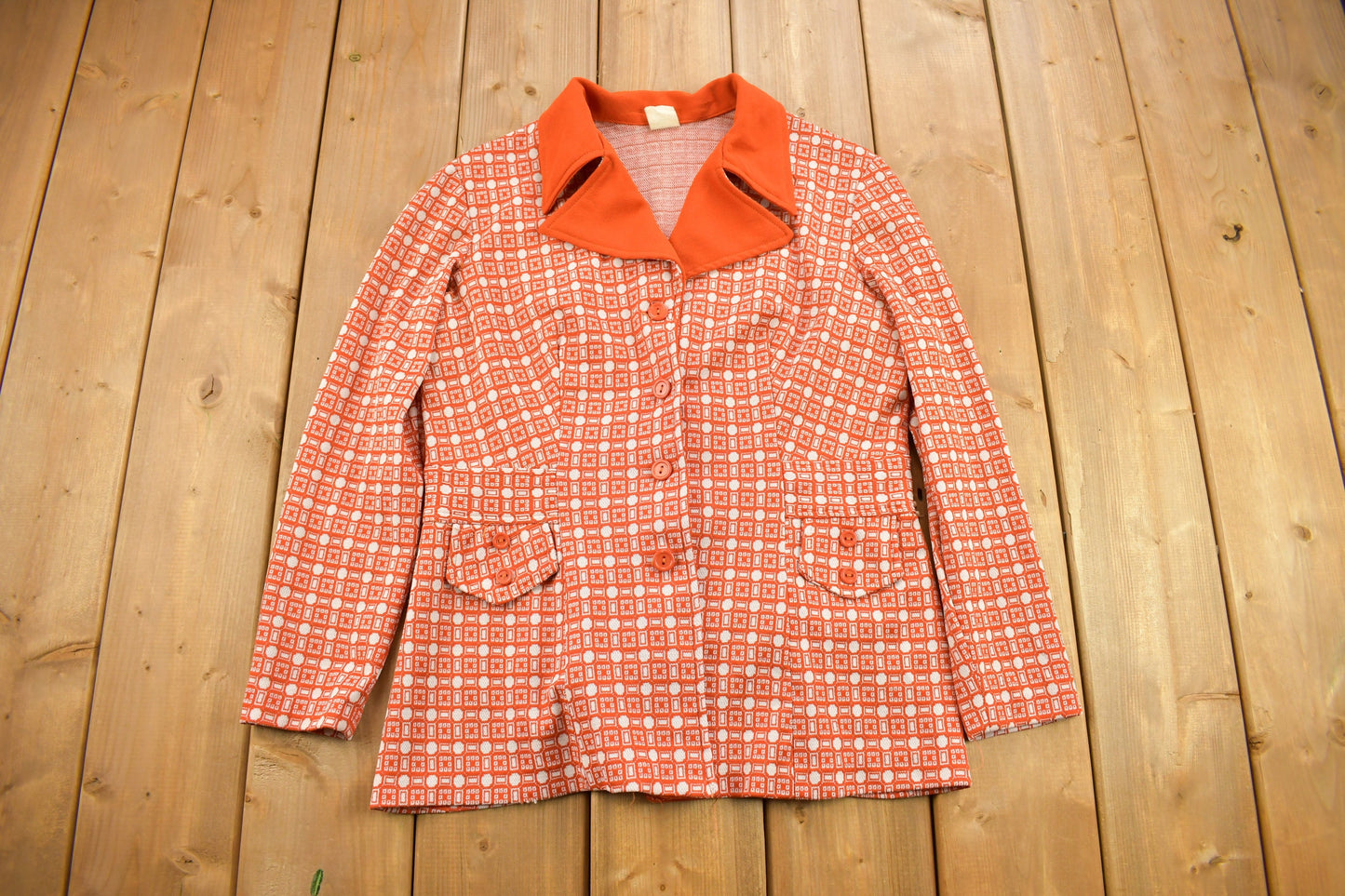 Vintage 1960s Orange Geo Metric Pattern Button Up Overcoat