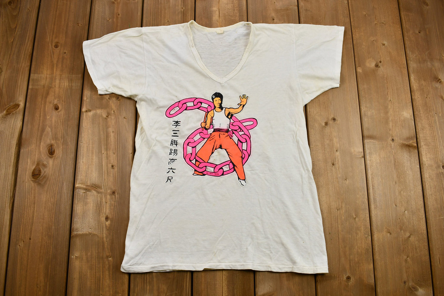 Vintage 1974 Naturally Distressed Bruce Lee Iron-On Graphic V-Neck T-Shirt